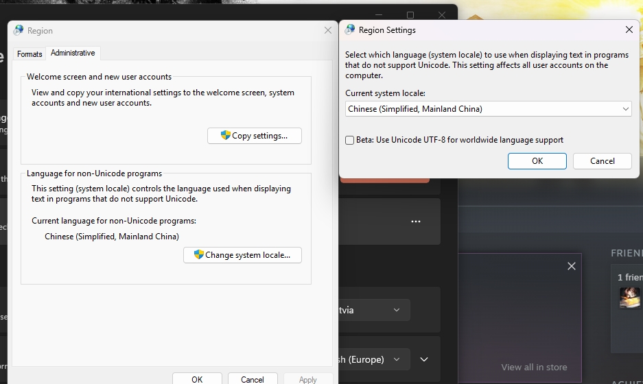 When the Region opens click on Administrative and then change current system locale to Simplified Chinese.